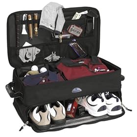 Organize the trunk of your car for golf or any sports. There is a pocket for your shoes, grips, jacket, gloves, etc. - Made of rip stop polyester with waterproof backing - Two levels expand for maximum usage - Folds down for easy storage - Assembles in height from 2 ' ' to 10 ' ' - Bottom level holds up to three pairs of shoes with compartment dividers - Ventilated mesh front door provides visibility, easy access and maximum aeration for drying and airing our shoes - Top level movable dividers make one to three different packing sections allowing easy organizing of shirts, jackets, socks, rain slickers, etc. - Top lid organizer has large mesh sections for gloves, tees, snacks and sunscreen - Mesh pocket holds money or small personal items - Eye glass/sunglass or cell phone pouch - Loops hold tools, grips, even cigars - Key holder - Two end carry handles made of ergonomic cushioned rubber - Reflective nylon web trim - Self-healing large nylon zippers with oversized zipper pulls